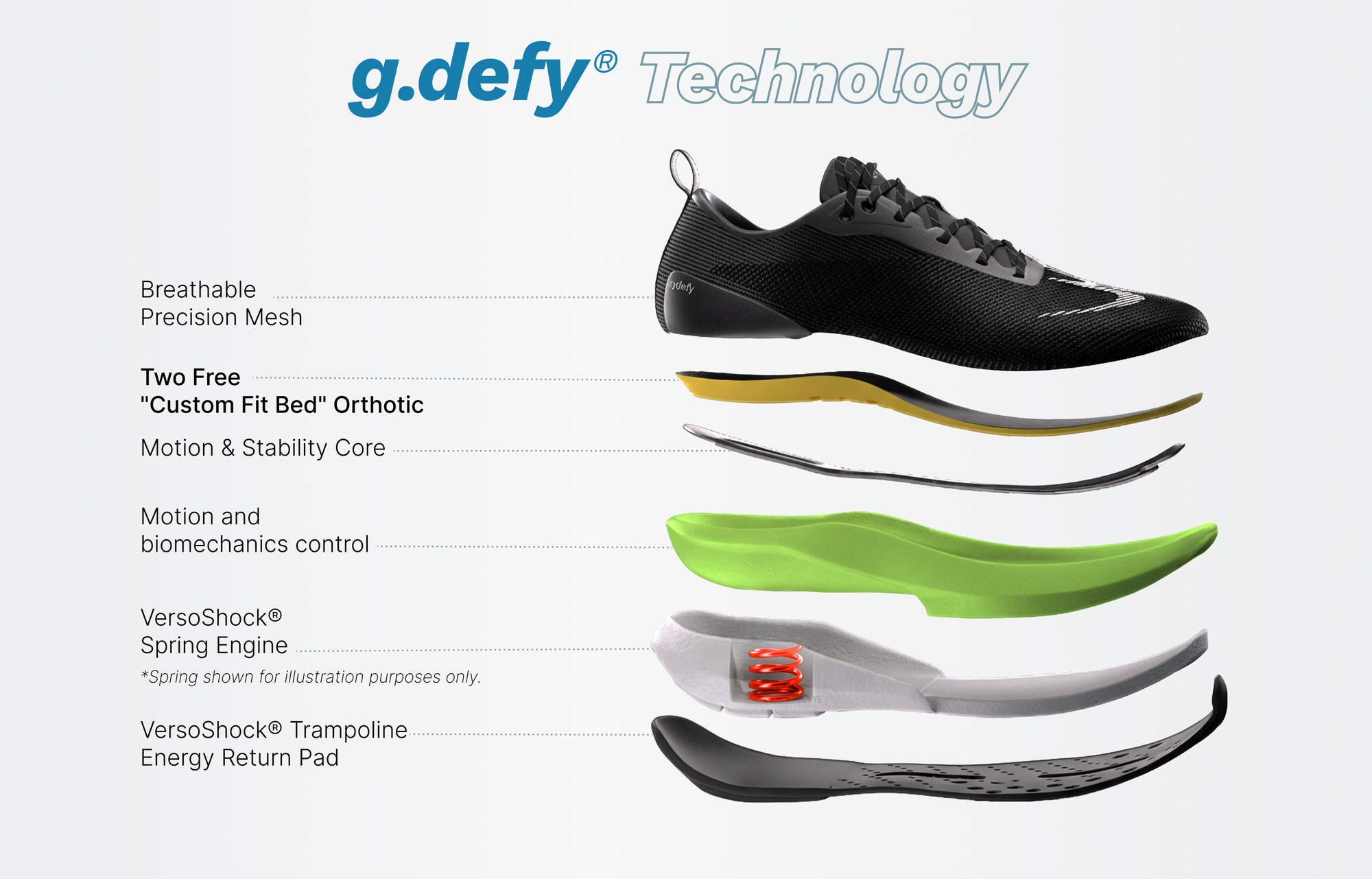 The result was g.defy® and its patented VersoShock® technology engineered to absorb impact and help reduce pain from walking, running, and prolonged standing.