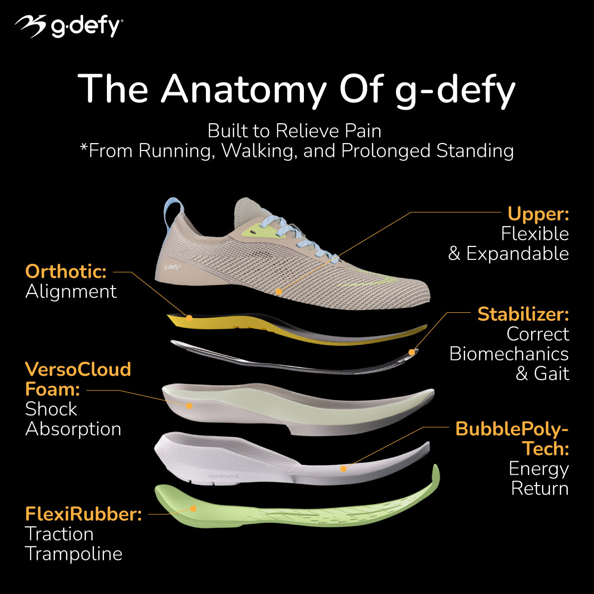 G-defy's patented spring system absorbs shock from the ground up, converting it into renewed positive energy. Harnessing chemical and thermal reactions on a cellular level, the multi-density sole of nucleated polymers recycle energy with spring-like efficiency, fueling confidence and performance.